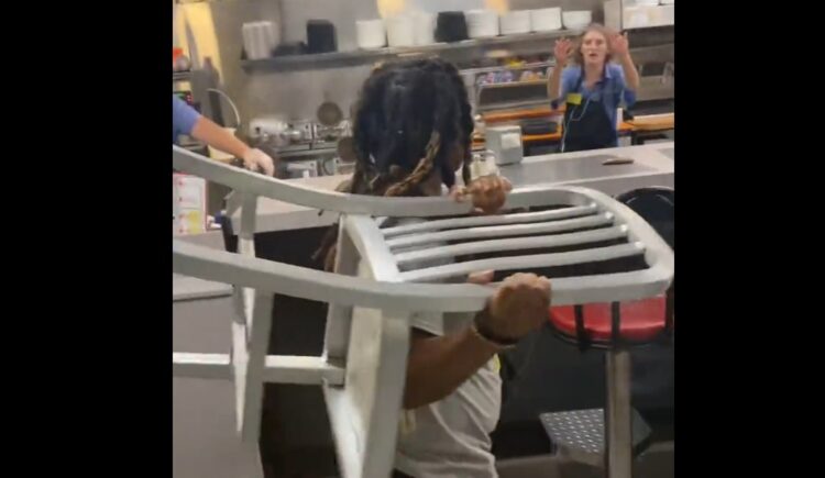 In the background, the first woman to climb the counter at the beginning of the video began throwing objects at another employee, who three items back at full force. Employees and customers associated with those involved in the scuffle interfered, trying to break up the fight. The woman who slipped behind the counter quickly grabbed a chair, hurled it at the employees and grabbed another within a second to throw at the white woman, who effortlessly blocked it.