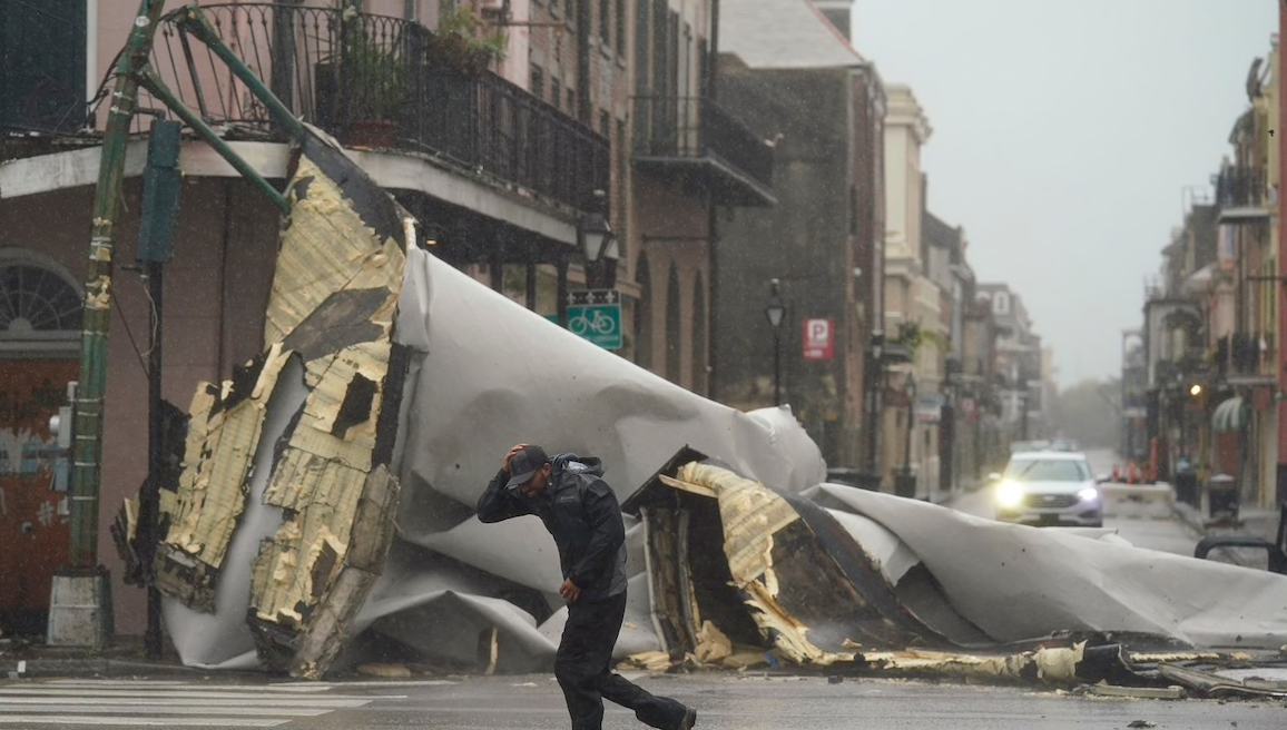 Part of a roof flew off in the #frenchquarter taking out a street light. Stay safe during #HurricaneIda @CBSMiami pic.twitter.com/CzNt8YXuKF