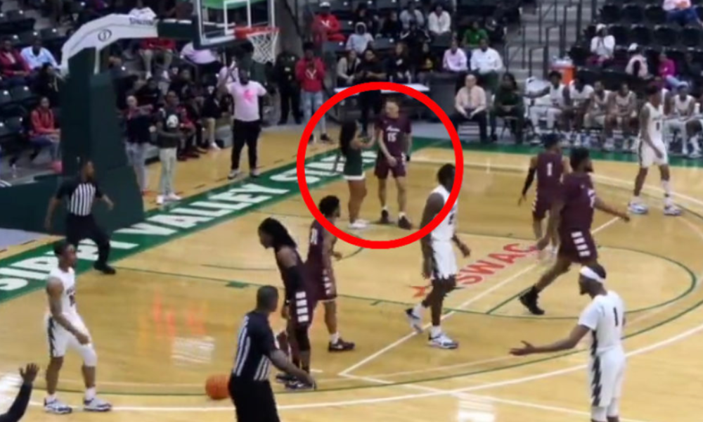 A few minutes later, the same cheerleader walked onto the court after a play and shoved A&M’s Smith.