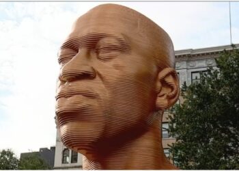 The grotesque incident shows a man in New York’s Union Square hanging around the George Floyd statue with a backpack.